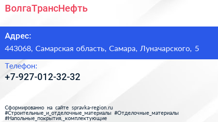 ВолгаТрансНефть по адресу 443068, Самарская область, Самара, Луначарского, 5 в дальнейшем Организация, размещена в следующих категориях: