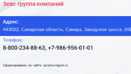 Зевс, группа компаний по адресу 443022, Самарская область, Самара, Заводское шоссе, 20Б в дальнейшем Организация, размещена в следующих категориях: