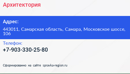 Архитектория по адресу 443011, Самарская область, Самара, Московское шоссе, 106 в дальнейшем Организация, размещена в следующих категориях: