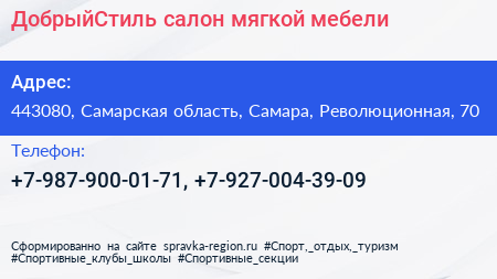 ДобрыйСтиль, салон мягкой мебели по адресу 443080, Самарская область, Самара, Революционная, 70 в дальнейшем Организация, размещена в следующих категориях: