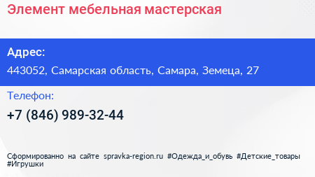 Элемент, мебельная мастерская по адресу 443052, Самарская область, Самара, Земеца, 27 в дальнейшем Организация, размещена в следующих категориях: