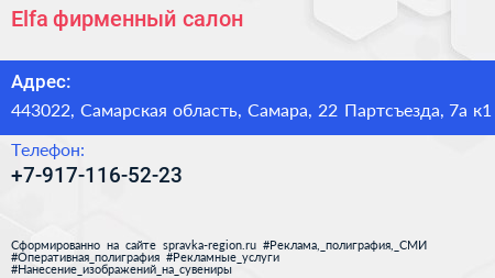 Elfa, фирменный салон по адресу 443022, Самарская область, Самара, 22 Партсъезда, 7а к1 в дальнейшем Организация, размещена в следующих категориях:
