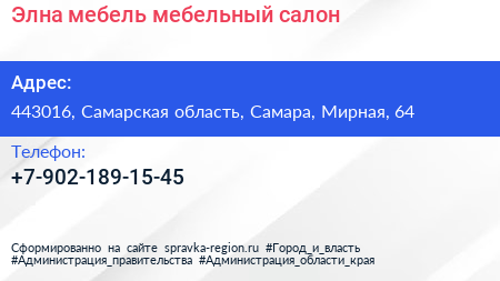 Элна мебель, мебельный салон по адресу 443016, Самарская область, Самара, Мирная, 64 в дальнейшем Организация, размещена в следующих категориях: