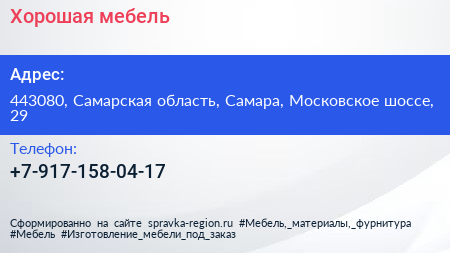 Хорошая мебель по адресу 443080, Самарская область, Самара, Московское шоссе, 29 в дальнейшем Организация, размещена в следующих категориях: