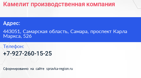 Камелит, производственная компания по адресу 443051, Самарская область, Самара, проспект Карла Маркса, 526 в дальнейшем Организация, размещена в следующих категориях: