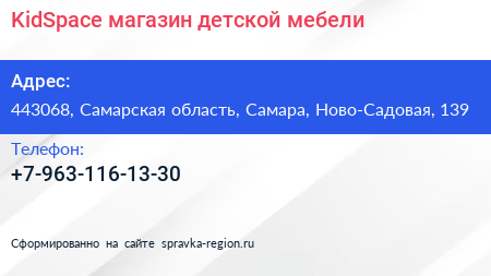KidSpace, магазин детской мебели по адресу 443068, Самарская область, Самара, Ново-Садовая, 139 в дальнейшем Организация, размещена в следующих категориях: