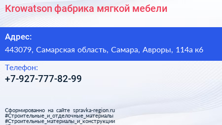 Krowatson, фабрика мягкой мебели по адресу 443079, Самарская область, Самара, Авроры, 114а к6 в дальнейшем Организация, размещена в следующих категориях: