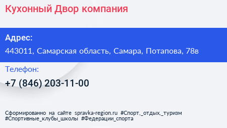 Кухонный Двор, компания по адресу 443011, Самарская область, Самара, Потапова, 78в в дальнейшем Организация, размещена в следующих категориях: