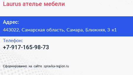 Laurus, ателье мебели по адресу 443022, Самарская область, Самара, Ближняя, 3 к1 в дальнейшем Организация, размещена в следующих категориях: