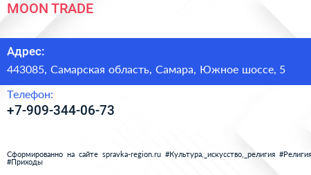 MOON-TRADE по адресу 443085, Самарская область, Самара, Южное шоссе, 5 в дальнейшем Организация, размещена в следующих категориях: