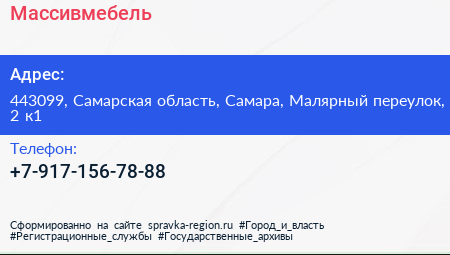 Массивмебель по адресу 443099, Самарская область, Самара, Малярный переулок, 2 к1 в дальнейшем Организация, размещена в следующих категориях: