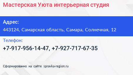 Мастерская Уюта, интерьерная студия по адресу 443124, Самарская область, Самара, Солнечная, 12 в дальнейшем Организация, размещена в следующих категориях: