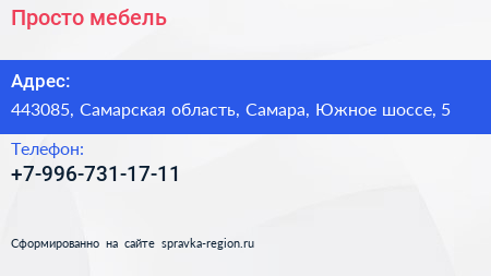 Просто мебель по адресу 443085, Самарская область, Самара, Южное шоссе, 5 в дальнейшем Организация, размещена в следующих категориях: