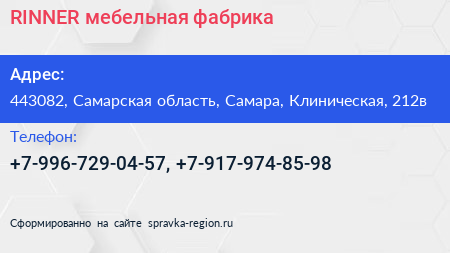 RINNER, мебельная фабрика по адресу 443082, Самарская область, Самара, Клиническая, 212в в дальнейшем Организация, размещена в следующих категориях: