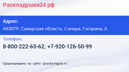Раскладушки24.рф по адресу 443079, Самарская область, Самара, Гагарина, 6 в дальнейшем Организация, размещена в следующих категориях: