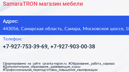 SamaraTRON, магазин мебели по адресу 443056, Самарская область, Самара, Московское шоссе, 18 в дальнейшем Организация, размещена в следующих категориях: