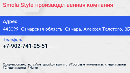 Smola Style, производственная компания по адресу 443099, Самарская область, Самара, Алексея Толстого, 8Б в дальнейшем Организация, размещена в следующих категориях: