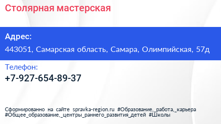 Столярная мастерская по адресу 443051, Самарская область, Самара, Олимпийская, 57д в дальнейшем Организация, размещена в следующих категориях: