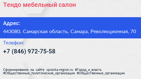 Тендо, мебельный салон по адресу 443080, Самарская область, Самара, Революционная, 70 в дальнейшем Организация, размещена в следующих категориях: