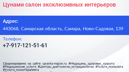 Цунами, салон эксклюзивных интерьеров по адресу 443068, Самарская область, Самара, Ново-Садовая, 139 в дальнейшем Организация, размещена в следующих категориях: