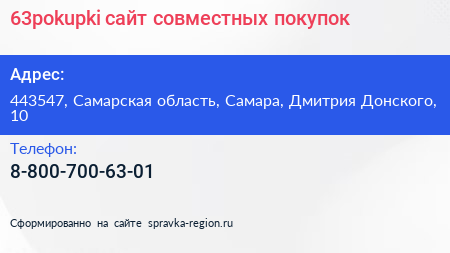 63pokupki, сайт совместных покупок по адресу 443547, Самарская область, Самара, Дмитрия Донского, 10 в дальнейшем Организация, размещена в следующих категориях:
