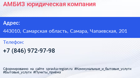АМБИЗ, юридическая компания по адресу 443010, Самарская область, Самара, Чапаевская, 201 в дальнейшем Организация, размещена в следующих категориях: