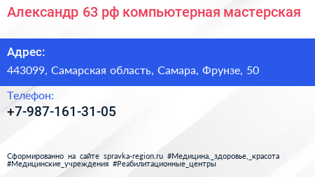 Александр-63.рф, компьютерная мастерская по адресу 443099, Самарская область, Самара, Фрунзе, 50 в дальнейшем Организация, размещена в следующих категориях: