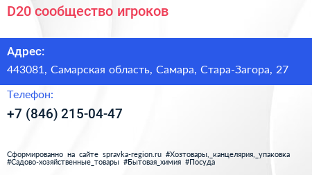D20, сообщество игроков по адресу 443081, Самарская область, Самара, Стара-Загора, 27 в дальнейшем Организация, размещена в следующих категориях: