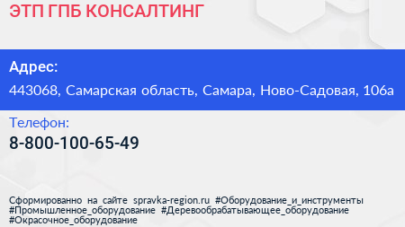 ЭТП ГПБ КОНСАЛТИНГ по адресу 443068, Самарская область, Самара, Ново-Садовая, 106а в дальнейшем Организация, размещена в следующих категориях: