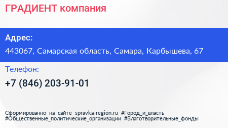 ГРАДИЕНТ, компания по адресу 443067, Самарская область, Самара, Карбышева, 67 в дальнейшем Организация, размещена в следующих категориях: