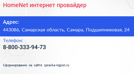 HomeNet, интернет-провайдер по адресу 443086, Самарская область, Самара, Подшипниковая, 24 в дальнейшем Организация, размещена в следующих категориях: