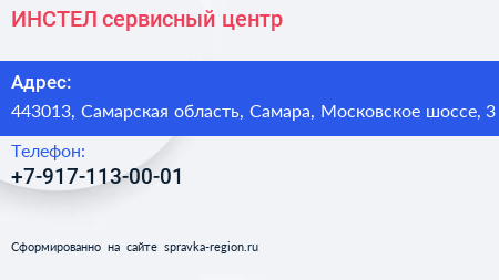 ИНСТЕЛ, сервисный центр по адресу 443013, Самарская область, Самара, Московское шоссе, 3 в дальнейшем Организация, размещена в следующих категориях: