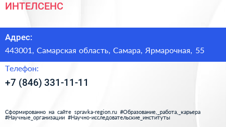 ИНТЕЛСЕНС по адресу 443001, Самарская область, Самара, Ярмарочная, 55 в дальнейшем Организация, размещена в следующих категориях: