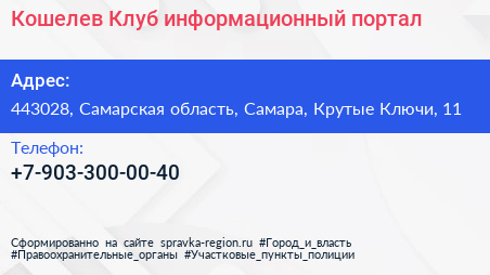 Кошелев Клуб, информационный портал по адресу 443028, Самарская область, Самара, Крутые Ключи, 11 в дальнейшем Организация, размещена в следующих категориях: