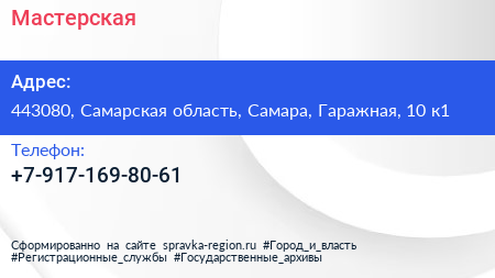 Мастерская по адресу 443080, Самарская область, Самара, Гаражная, 10 к1 в дальнейшем Организация, размещена в следующих категориях: