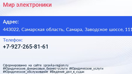 Мир электроники по адресу 443022, Самарская область, Самара, Заводское шоссе, 111 в дальнейшем Организация, размещена в следующих категориях: