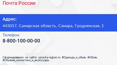 Почта России по адресу 443017, Самарская область, Самара, Гродненская, 1 в дальнейшем Организация, размещена в следующих категориях: