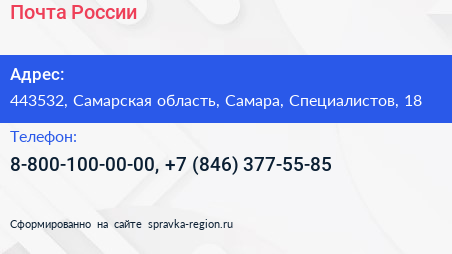 Почта России по адресу 443532, Самарская область, Самара, Специалистов, 18 в дальнейшем Организация, размещена в следующих категориях:
