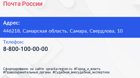 Почта России по адресу 446218, Самарская область, Самара, Свердлова, 10 в дальнейшем Организация, размещена в следующих категориях: