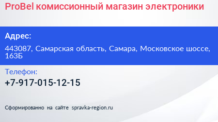 ProBel, комиссионный магазин электроники по адресу 443087, Самарская область, Самара, Московское шоссе, 163Б в дальнейшем Организация, размещена в следующих категориях:
