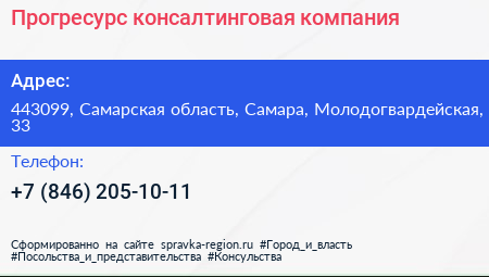 Прогресурс, консалтинговая компания по адресу 443099, Самарская область, Самара, Молодогвардейская, 33 в дальнейшем Организация, размещена в следующих категориях: