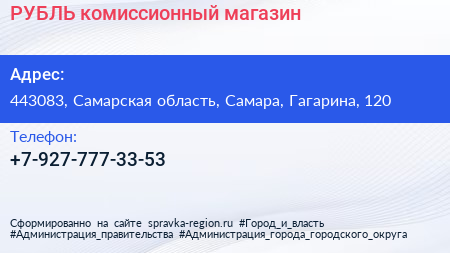 РУБЛЬ, комиссионный магазин по адресу 443083, Самарская область, Самара, Гагарина, 120 в дальнейшем Организация, размещена в следующих категориях:
