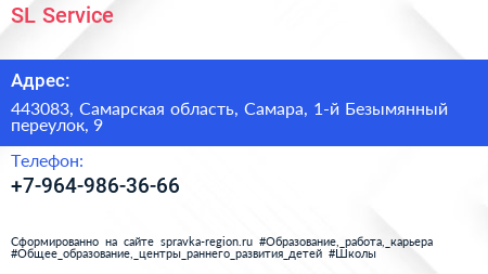 SL-Service по адресу 443083, Самарская область, Самара, 1-й Безымянный переулок, 9 в дальнейшем Организация, размещена в следующих категориях: