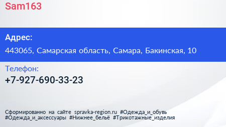 Sam163 по адресу 443065, Самарская область, Самара, Бакинская, 10 в дальнейшем Организация, размещена в следующих категориях: