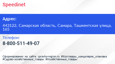 Speedinet по адресу 443122, Самарская область, Самара, Ташкентская улица, 165 в дальнейшем Организация, размещена в следующих категориях: