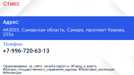 Стикс по адресу 443035, Самарская область, Самара, проспект Кирова, 255а в дальнейшем Организация, размещена в следующих категориях: