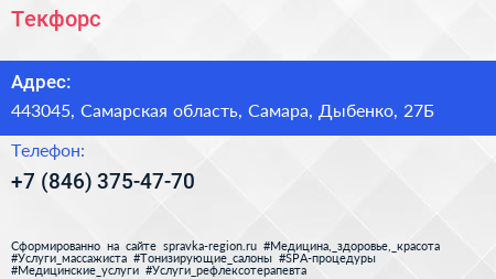 Текфорс по адресу 443045, Самарская область, Самара, Дыбенко, 27Б в дальнейшем Организация, размещена в следующих категориях: