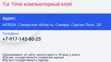 Tur Time, компьютерный клуб по адресу 443026, Самарская область, Самара, Сергея Лазо, 28 в дальнейшем Организация, размещена в следующих категориях: