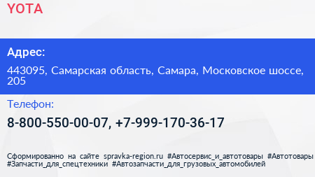 YOTA по адресу 443095, Самарская область, Самара, Московское шоссе, 205 в дальнейшем Организация, размещена в следующих категориях: