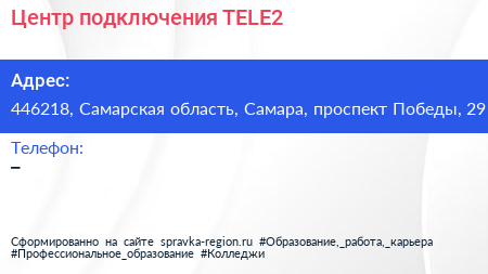 Центр подключения TELE2 по адресу 446218, Самарская область, Самара, проспект Победы, 29 в дальнейшем Организация, размещена в следующих категориях: